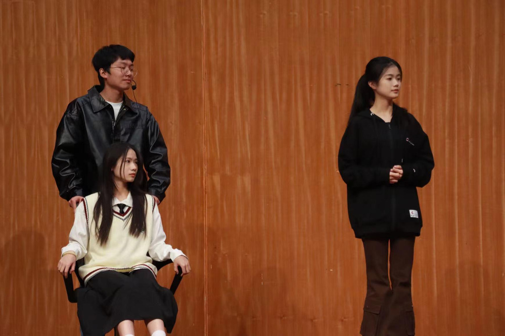 由20231812班带来的《走出阴霾,面对光明》,针对如今青少年的心理健康问题日益增多,简单常见的是生活中来自陌生人的恶意和不被理解,他们的表演讲述了一位普通女孩穿透阴霾,破云而出的蜕变的故事。