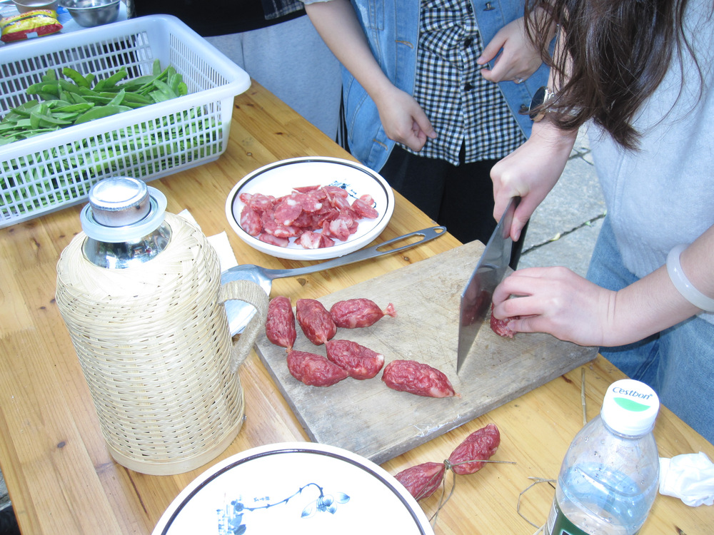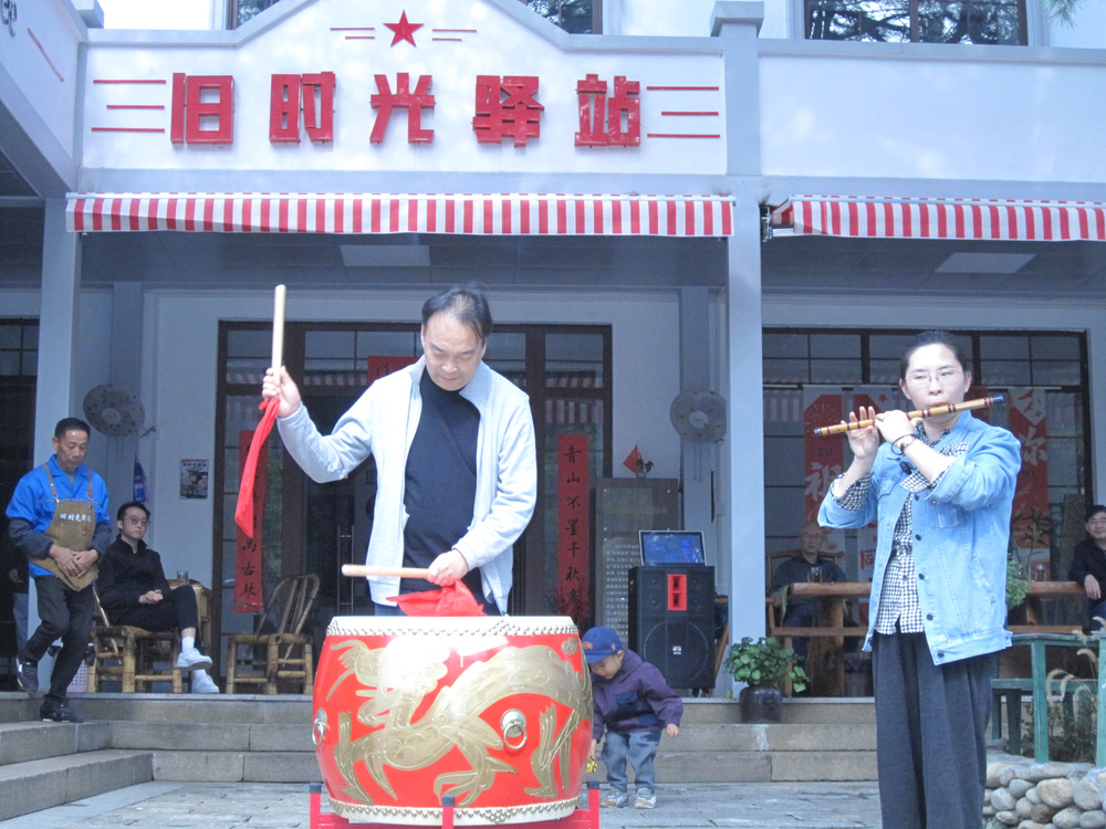 抵达活动现场后,趣味团队游戏率先拉开序幕,师生们在互动协作中迅速破冰,为活动预热。午餐时段,“旧时光驿站”内开展的“我的拿手菜”环节成为亮点:通过“盲选JOKER”完成分组,借助“专业术语你说我猜”赢取积分兑换食材,我院师生与体育学院团队默契协作,共同烹制的“荷兰豆炒腊肠”赢得现场一致好评。这一环节不仅打破学院壁垒,推动跨学科专业交流,更让师生在烟火气中感受乡村生活的质朴与温暖。活动期间,毛云岗教授与研究生孙婧充分发挥专业特长,就地取材以民族打击乐搭配竹笛,联袂演绎《金蛇狂舞》,明快激昂的旋律瞬间点燃现场氛围,展现我院学子的艺术素养与导学团队的活力风采。午后,师生们沿天字古道漫步,在青山环抱、绿水环绕间沉浸式感受湖州的自然之美,让身心在田园风光中得到放松。