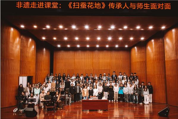 11月5日下午,我院2024级本科与2025级专升本全体同学于音乐厅共同体验了一堂特色鲜明的劳动教育实践课。国家级非物质文化遗产“蚕桑习俗(扫蚕花地)”的代表性传承人陆美红再次应邀走进校园,与现场百余名师生分享了这一起源于德清、流传于杭嘉湖蚕桑地区的传统民俗歌舞的魅力,让古老的非遗在高校课堂上“活”了起来。