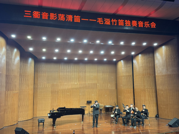 2025年6月4日晚,由湖州师范学院音乐学院主办、毛云岗教授倾力指导的“三衢音影荡清笛——毛溢竹笛独奏音乐会”在我校音乐厅成功上演。我院党总支书记何小勤、副院长周媛及音乐学院部分师生共200余人齐聚一堂,共同观看了这场具有民族风情的音乐盛宴。