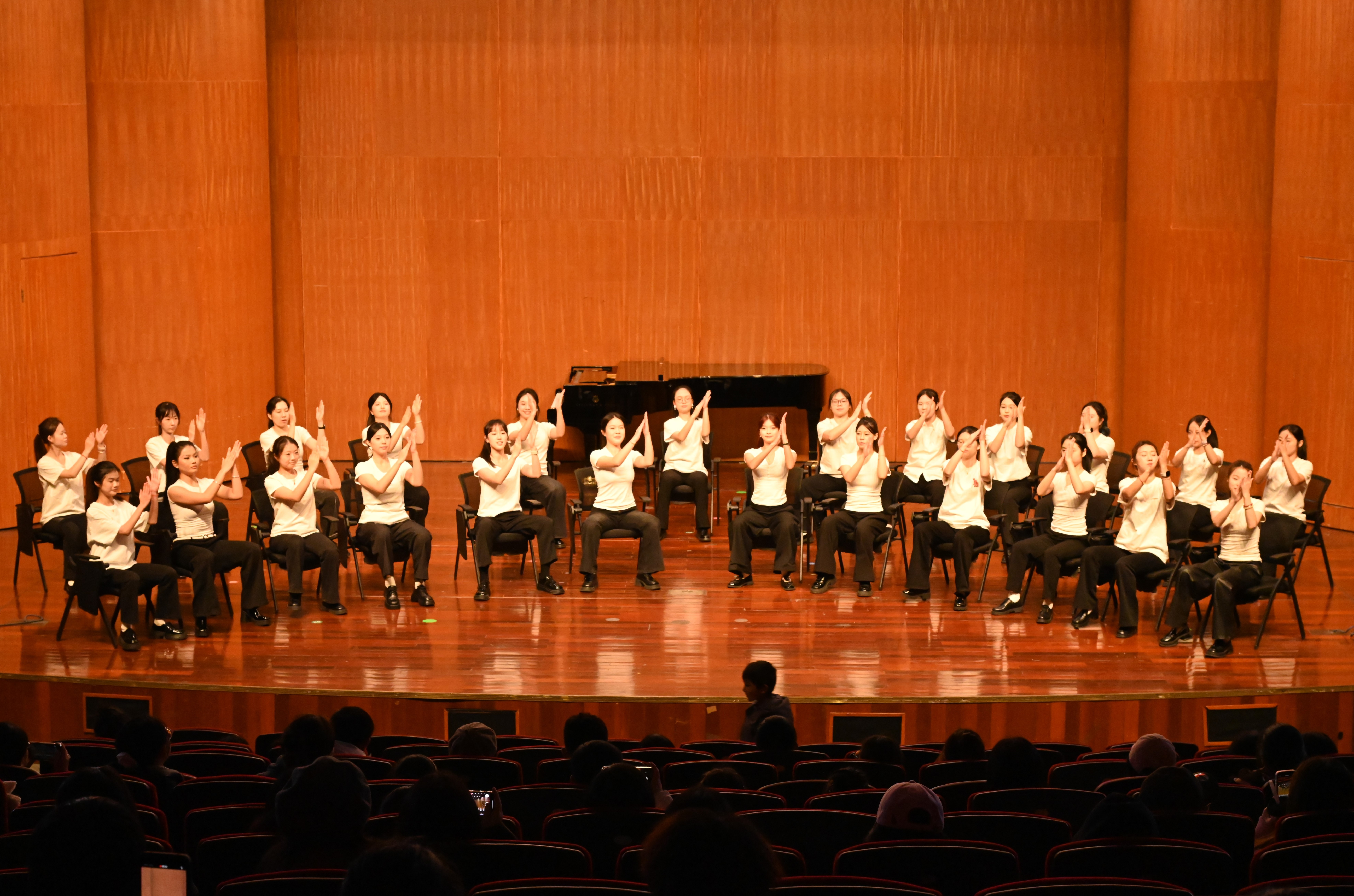 音乐会开场气势十足。在边秀梅老师指导下,何沁桐、杨书昳等同学带来的团体声势表演《Sharks》以强烈的节奏张力迅速点燃现场氛围,观众在整齐有力的声势律动中感受身体与音乐的深度联结。随后,声乐、器乐等多元节目轮番登场,呈现出“经典传承与舞台创新并举、个人技艺与团队协作并重”的鲜明特点。