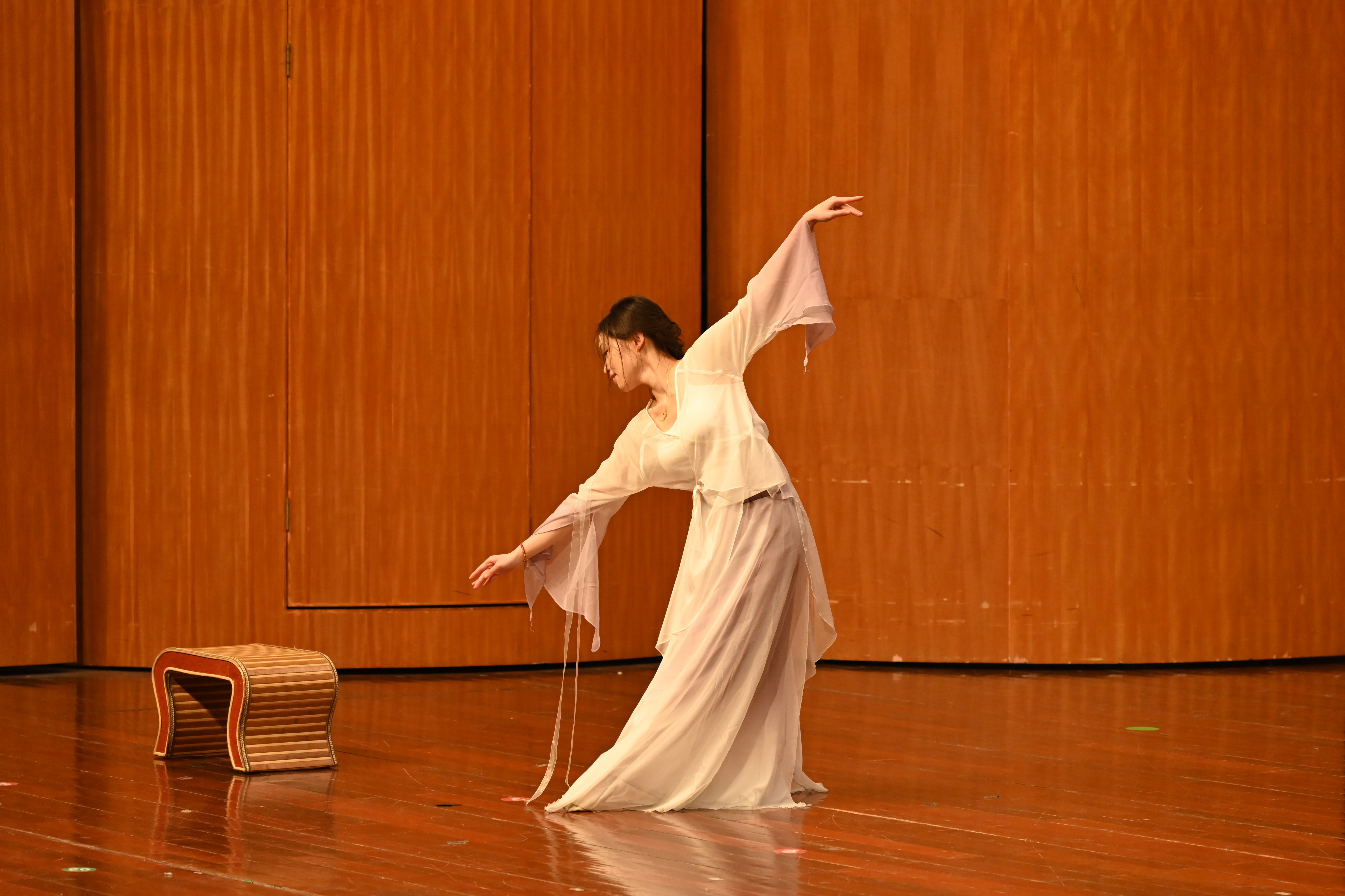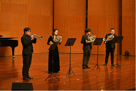 融合创新的节目设置进一步拓展了舞台表达的层次感。彭铭曦带来的《板凳上的悄悄话》以灵动表演勾勒生活意趣;张赫、杨玉伟等同学的铜管四重奏《猎人合唱》音色交织、层次分明,营造出富有画面感的音乐意境;王晴演唱《一首桃花》,在虞佳烨钢琴伴奏、周鸿宇小提琴协奏下,诗意旋律交融相映,展现出良好的舞台协作与艺术感染力。如兰、刘雅婷等同学表演的《诗画江南》以艺术化方式描绘江南意象;虞佳烨、王芷菁四手联弹《我的祖国》(李妍冰改编)以双钢琴合奏焕新经典旋律,在深情与昂扬的音乐表达中引发全场共鸣。