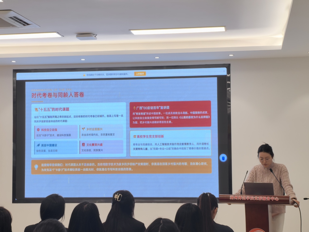 活动核心环节由沈露老师主讲《与国同行》微党课。党课以“与新时代青年的一次初心对话”为切入点,从2026年网络热词切入,厘清孤芳自赏、精致利己与扎根奋斗、胸怀家国的本质区别,指出真正的“爱己”是在奋斗中绽放青春。立足“十五五”规划开局之年,党课围绕科技自立自强、乡村全面振兴等时代课题,结合鲜活案例,阐释个人与时代“双向奔赴”的内涵,倡导用青年视角转化党的创新理论,通过“话题切入—联系实际—理解政策—指导实践”的路径,让理论学习融入日常。她勉励青年党员把握新赛道机遇,投身创新创造,扎根奉献,以“功成不必在我,功成必定有我”的境界书写青春担当。